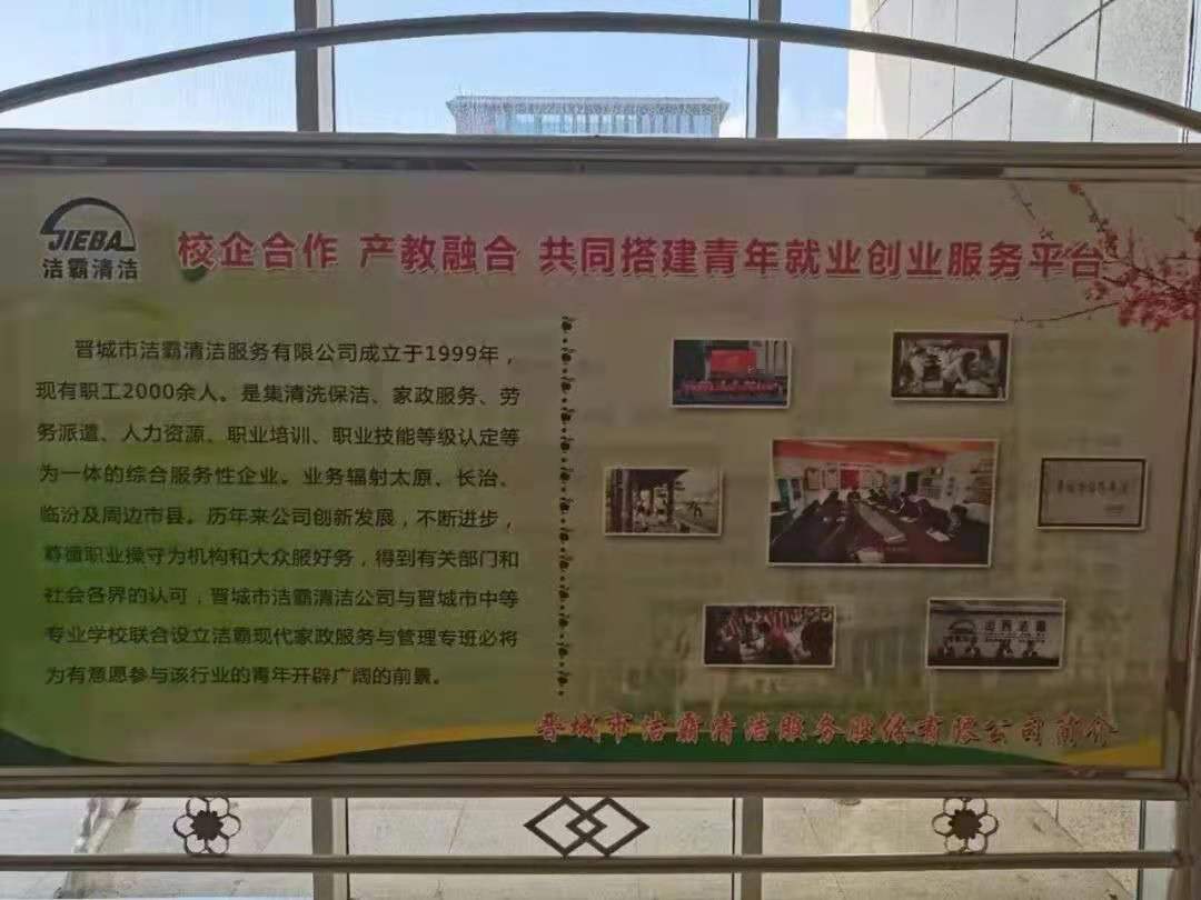 5月25日,是晉城市中等專(zhuān)業(yè)學(xué)校的“家長(cháng)開(kāi)放日”;顒(dòng)當天,晉城潔霸清潔服務(wù)股份有限公司攜手晉城市中等專(zhuān)業(yè)學(xué)校,共同開(kāi)展了“校企合作,產(chǎn)教融合, 共同搭建青年就業(yè)創(chuàng )業(yè)服務(wù)平臺”主題活動(dòng)。