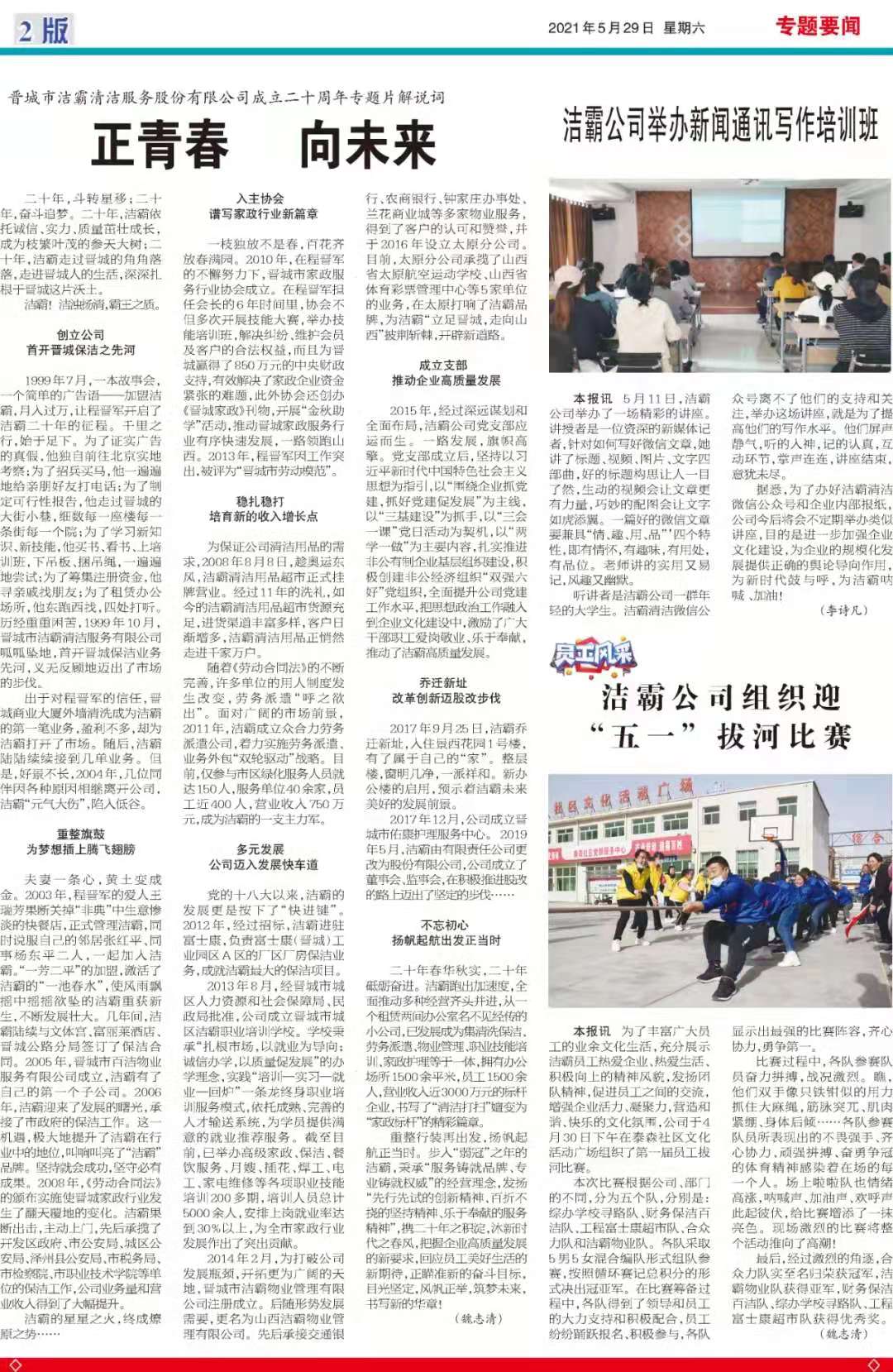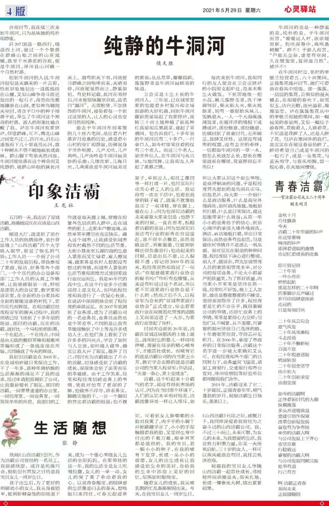 今天是2021年5月29日,經(jīng)過(guò)一個(gè)多月的緊張籌辦,《山西潔霸》報紙終于創(chuàng )刊啦!這是潔霸人的一件大喜事,也是潔霸人的驕傲!伴隨著(zhù)《山西潔霸》紙質(zhì)版的內部發(fā)行,電子版也同步與你見(jiàn)面了。希望你能通過(guò)這個(gè)宣傳窗口,更好地走近潔霸,了解潔霸,關(guān)注潔霸,支持潔霸。