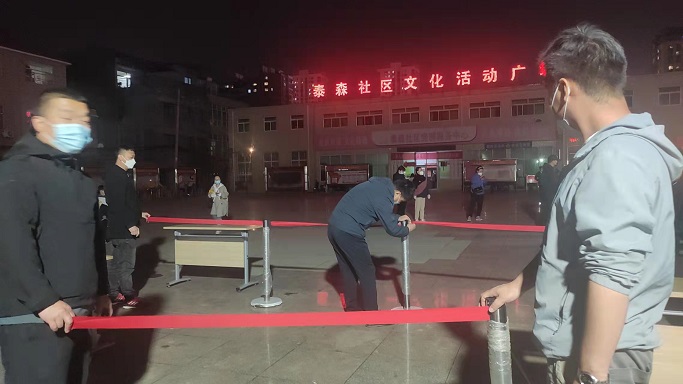 在泰森社區文化活動(dòng)廣場(chǎng),志愿者們擺桌子、拉警戒線(xiàn)、撐帳篷,齊心合力協(xié)助社區工作人員完成核酸檢測采樣點(diǎn)位設置及物資配備,同時(shí)積極引導社區居民進(jìn)行掃碼登記、測量體溫,提醒社區居民全程佩戴口罩,在排隊期間保持一米間距,組織居民做好分組,提前亮碼,核酸檢測完成后有序離場(chǎng)。雖然天氣較冷,但志愿者們毫無(wú)怨言,服務(wù)熱情很高,直至晚上12點(diǎn),協(xié)助社區完成了9000余人的核酸檢測工作。
