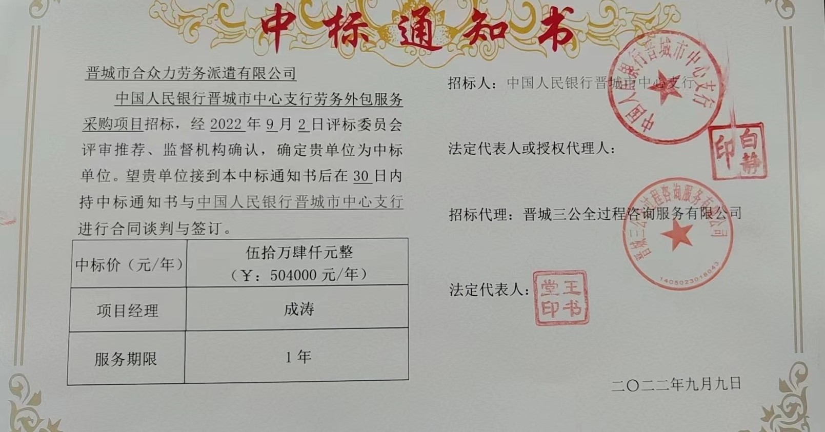 近日,晉城市合眾力勞務(wù)派遣有限公司收到《中標通知書(shū)》,確定公司為中國人民銀行晉城市中心支行勞務(wù)外包服務(wù)采購項目的中標人,中標金額504000元。