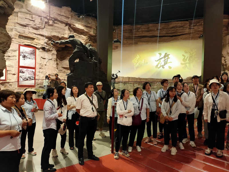 走進(jìn)紅旗渠紀念館,大家跟隨講解員的腳步,在千年旱魔,世代抗爭;紅旗引領(lǐng),創(chuàng )造奇跡;英雄人民,太行豐碑;山河巨變,實(shí)現夢(mèng)想;繼往開(kāi)來(lái),精神永恒五個(gè)部分逐一駐足學(xué)習,通過(guò)一件件珍貴的物品,一幅幅生動(dòng)的圖片、一幀幀震撼的畫(huà)面、一個(gè)個(gè)感人的故事,讓大家身臨其境感受到林州人民建造人工天河時(shí)不畏艱險,頑強拼搏,緊靠一錘一鏟削平1250座山頭、鑿通211個(gè)隧道、架設151個(gè)渡槽的恢弘場(chǎng)景。在場(chǎng)的各位都深深地被“自力更生、艱苦創(chuàng )業(yè)、團結協(xié)作、無(wú)私奉獻”的紅旗渠精神所感動(dòng),切實(shí)感受到中華民族勤勞堅韌的優(yōu)良傳統,領(lǐng)悟社會(huì )主義是干出來(lái)的,新時(shí)代是奮斗出來(lái)的。