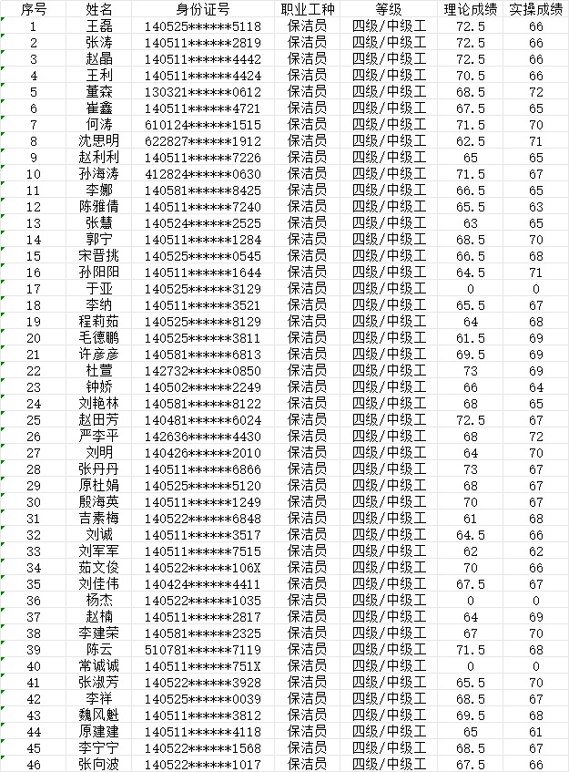 晉城市潔霸清潔服務(wù)股份有限公司職業(yè)技能等級認定中心2024年1月21日下午第4批保潔員中級認定人員成績(jì)公示
