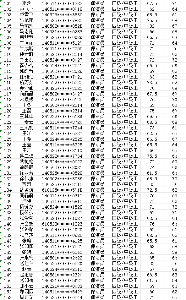 晉城市潔霸清潔服務(wù)股份有限公司職業(yè)技能等級認定中心現將2024年1月28日認定人員成績(jì)公示如下: