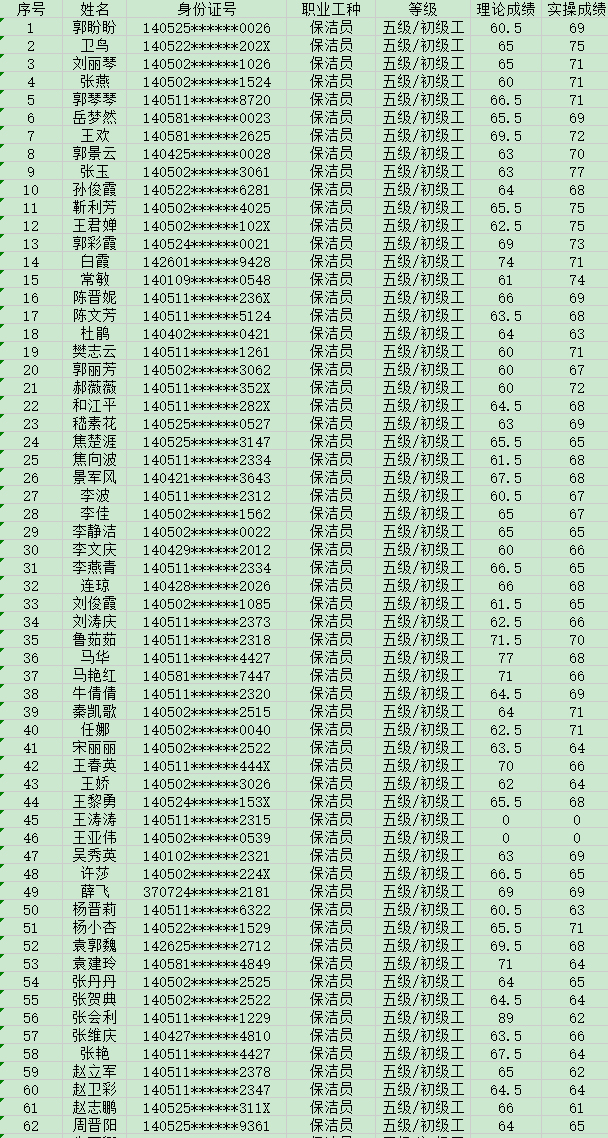 晉城市潔霸清潔服務(wù)股份有限公司職業(yè)技能等級認定中心現將2024年6月2日認定人員成績(jì)公示如下: