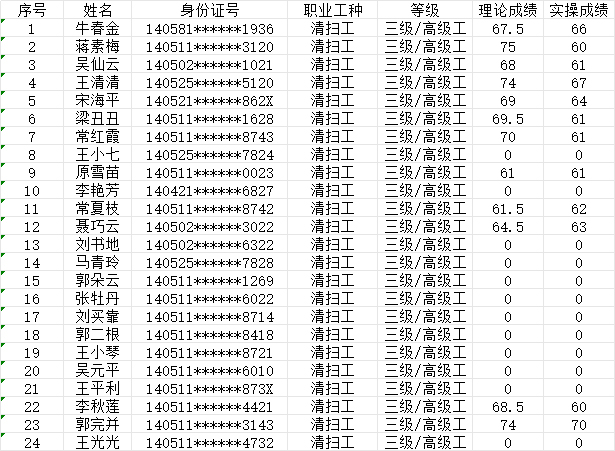 晉城市潔霸清潔服務(wù)股份有限公司職業(yè)技能等級認定中心現將2024年6月30日認定人員成績(jì)公示如下: