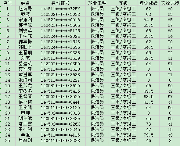 晉城市潔霸清潔服務(wù)股份有限公司職業(yè)技能等級認定中心現將2024年8月10日認定人員成績(jì)公示如下: