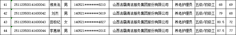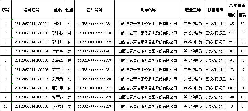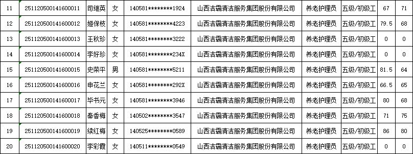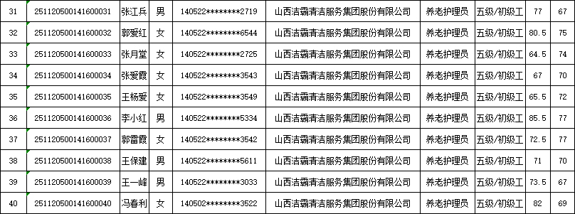 山西潔霸清潔服務(wù)集團股份有限公司職業(yè)技能等級認定中心現將2025年11月22日認定人員成績(jì)公示如下:
